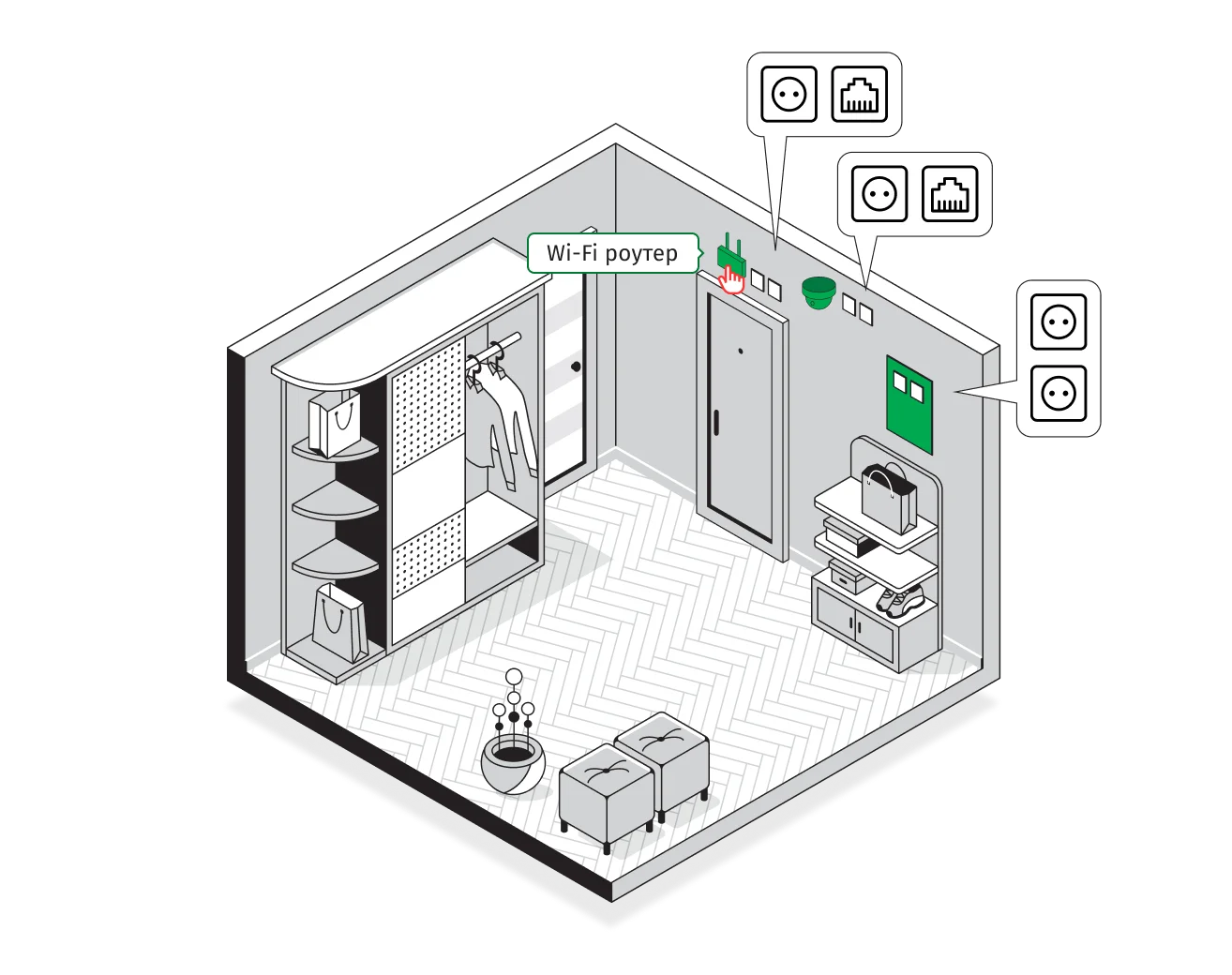 1 розетка 220В в месте установки роутера,