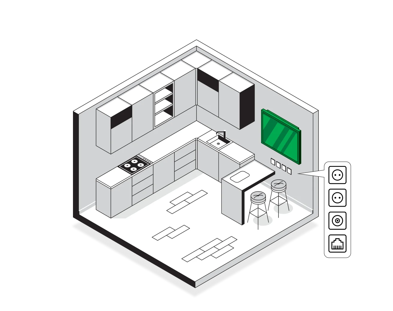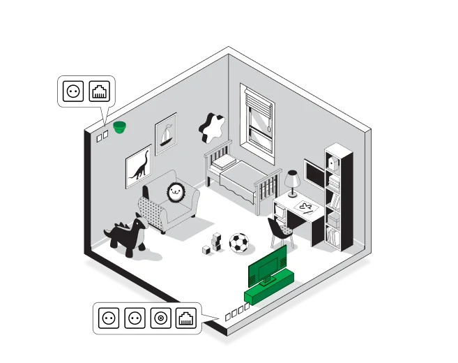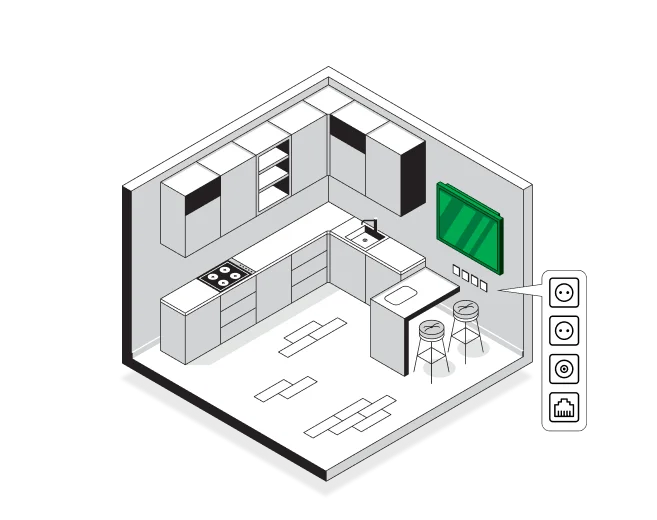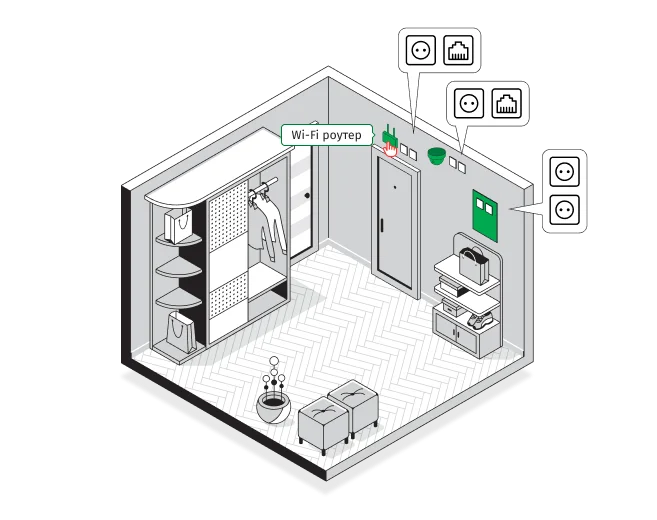2 розетки 220В + 1 розетка Ethernet + 1 розетка под коаксиальный кабель в месте установки телевизора.