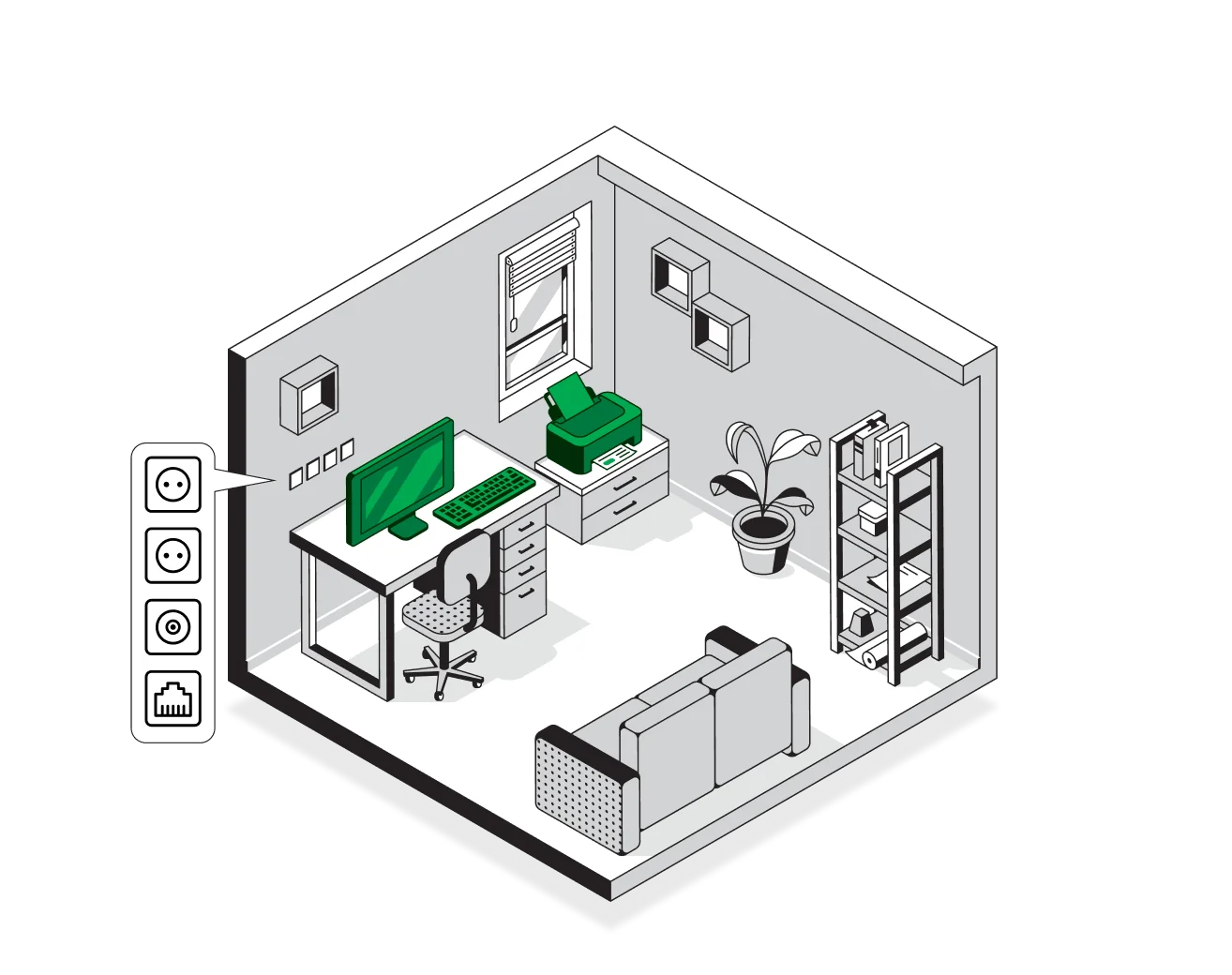 Рекомендовано предусмотреть 3 розетки 220В + 1 розетка Ethernet в месте установки ПК и другой техники.